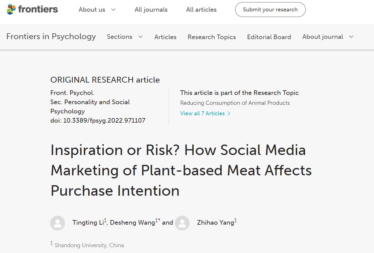 近日,公司王德胜教授作为通讯作者在SSCI收录期刊《Frontiers in Psychology》(JCR 1区期刊,2022年10月)发表论文《Inspiration or risk? How social media marketing of plant-based meat affects young people’s purchase intention》,BB贝博艾弗森为唯一通讯作者单位。《Frontiers in Psychology》是综合性的心理学领域专业学术期刊,创立于2010年,已被国际社会科学引文索引(Social Science Citation Index,SSCI)数据库正式收录,2022年影响因子(impact factor,IF)为2.99,论文总引用率排名第一,涵盖了几乎所有心理学领域的研究主题。