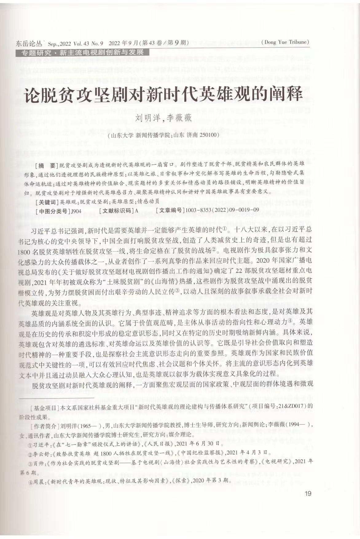近日,公司刘明洋教授和博士生李薇薇在CSSCI来源期刊东岳论丛2022年第9发表论文论脱贫攻坚剧对新时代英雄观的阐释》。